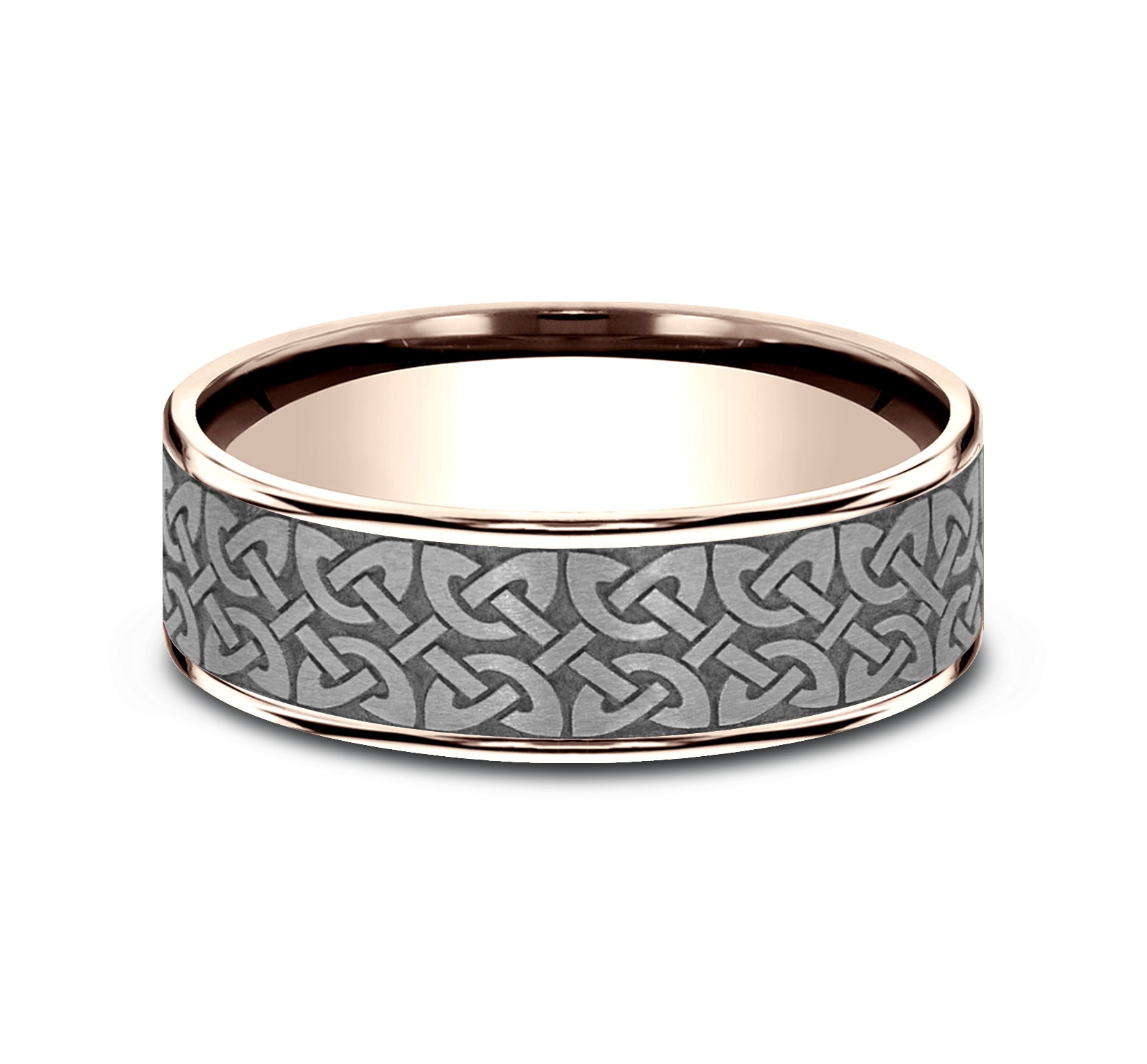 7.5mm, Comfort fit 14K Rose Gold and Grey Tantalum Celtic knot designed center, thin polished edges