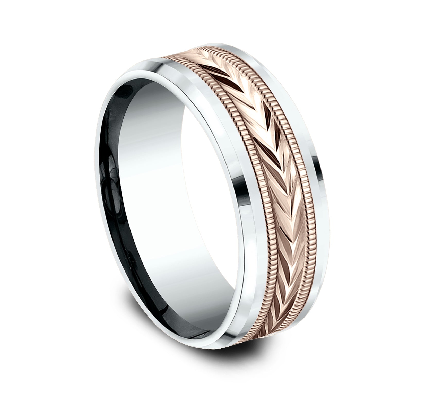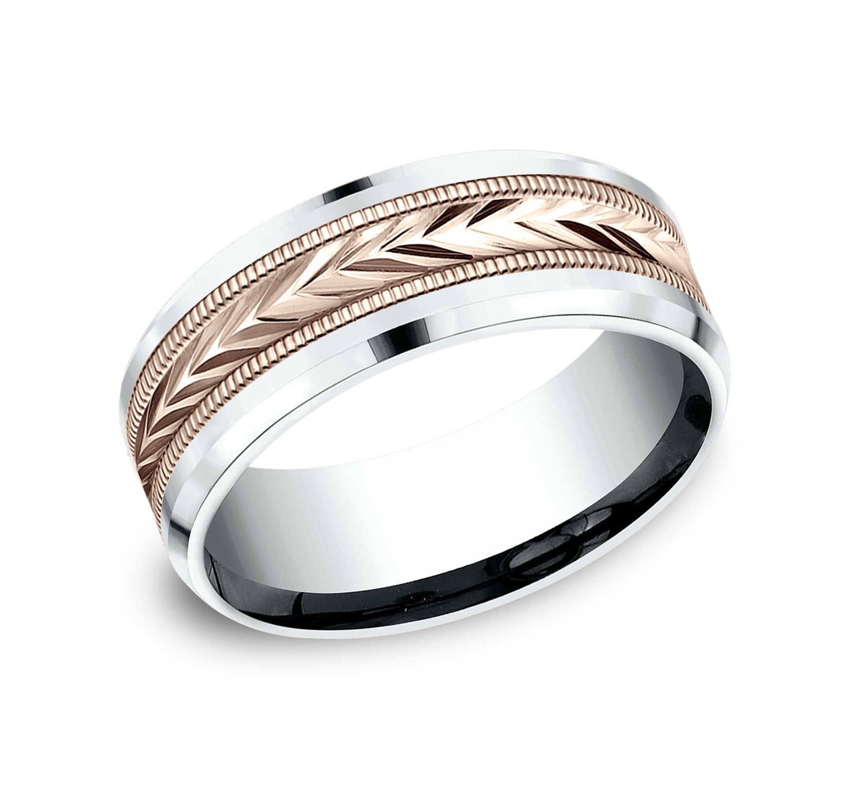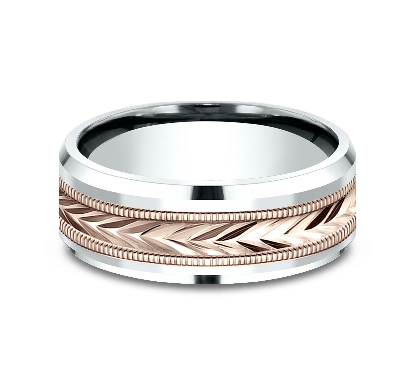 8mm, Comfort fit 14K White and Rose Gold Wheat pattern with milgrain detail, polished bevel edges