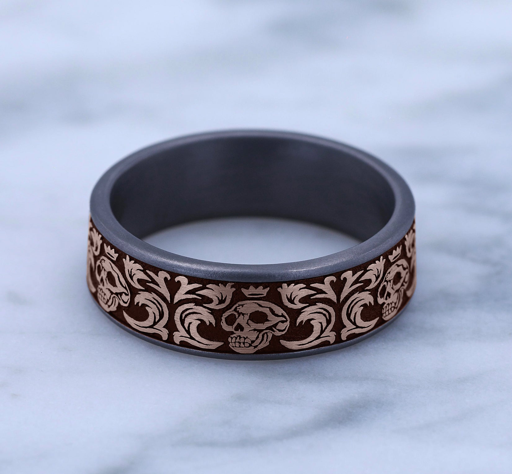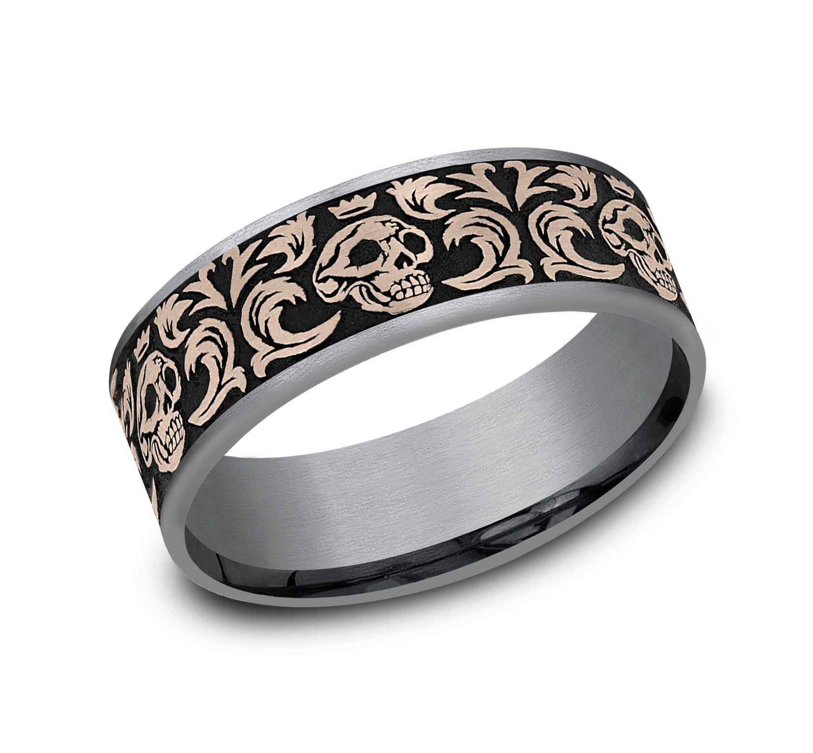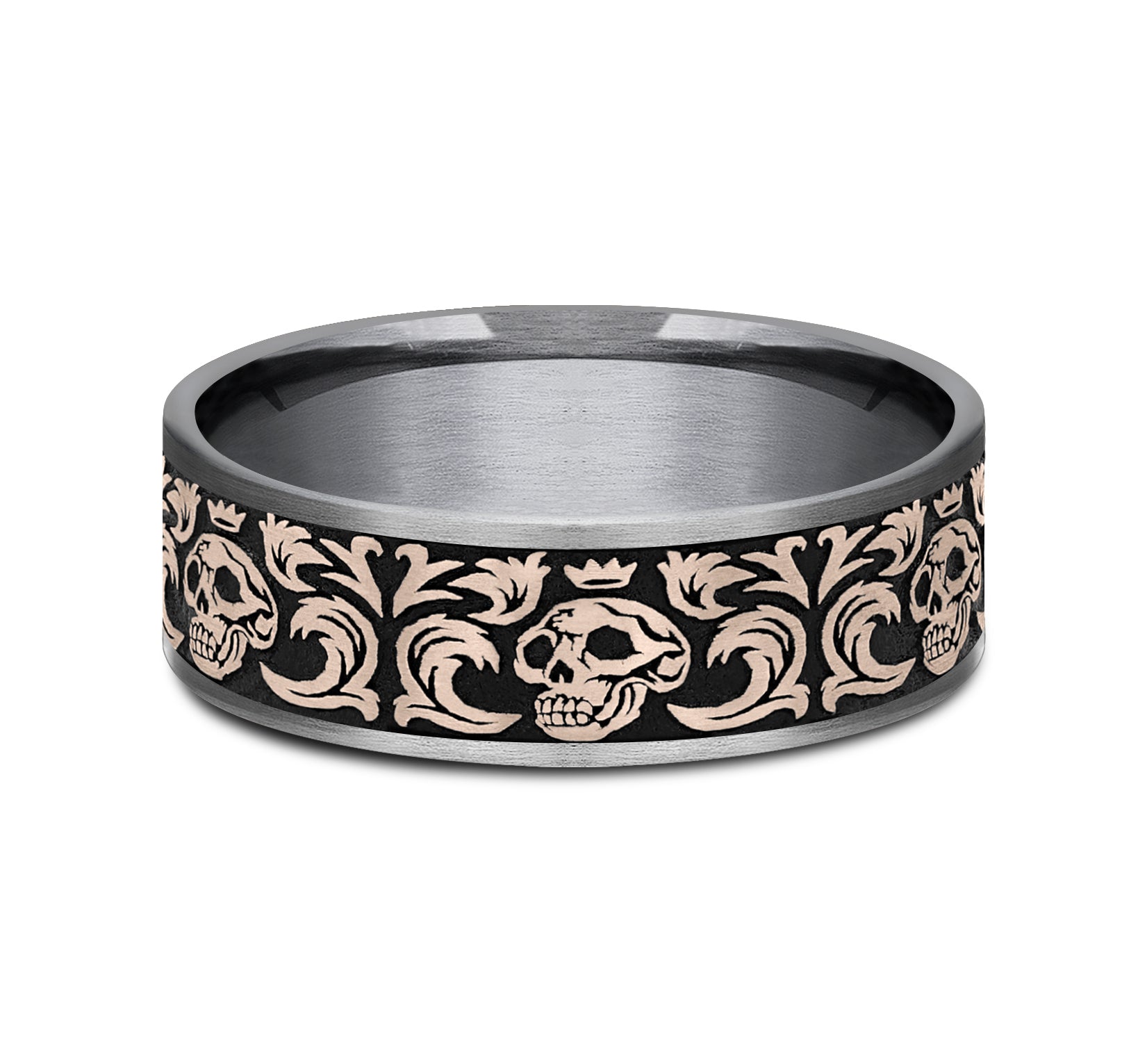 7.5mm, Comfort fit Grey Tantalum and 14K Rose Gold Skull king pattern, thin edges