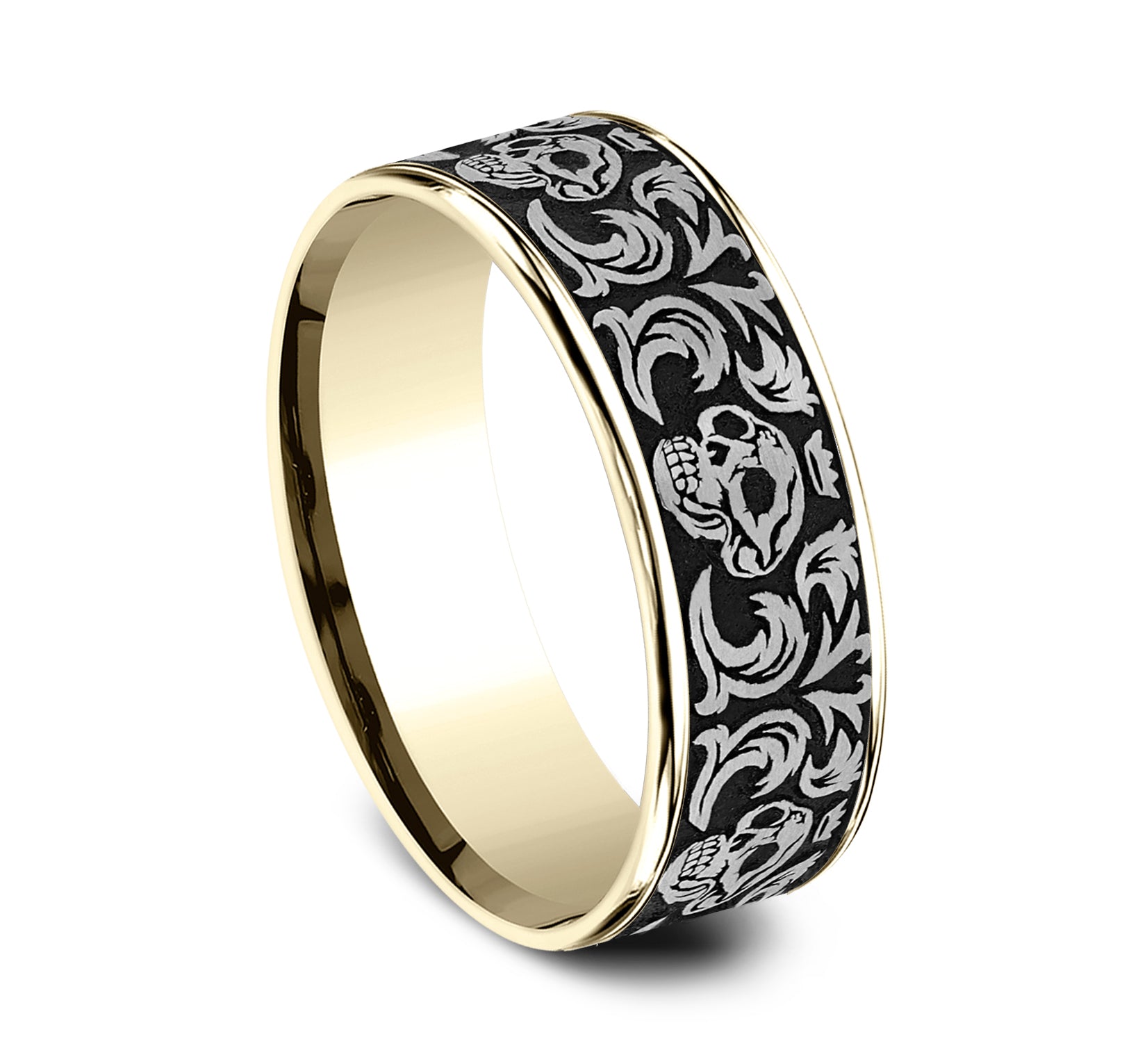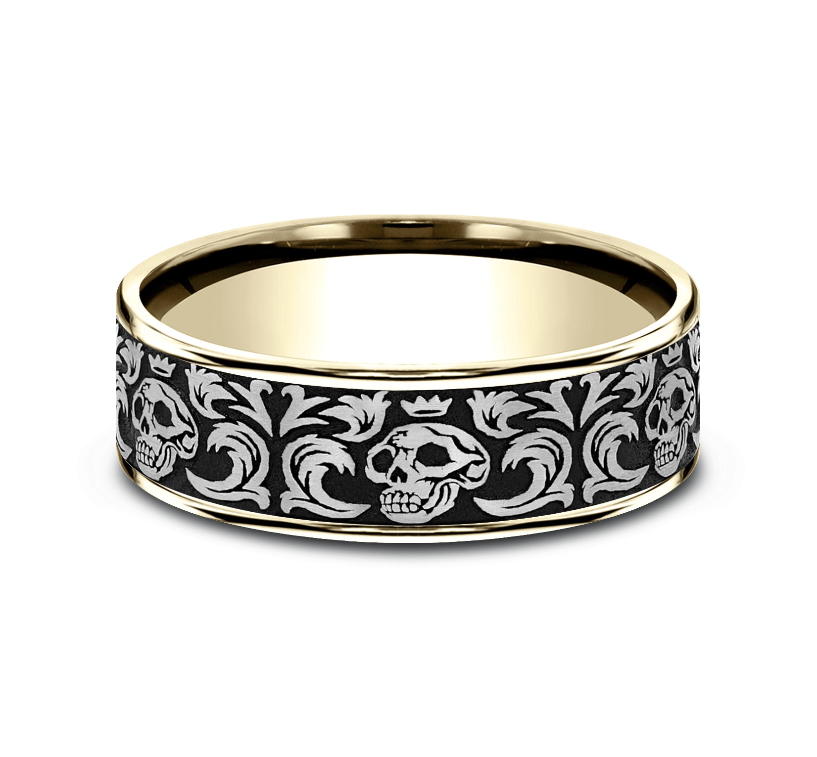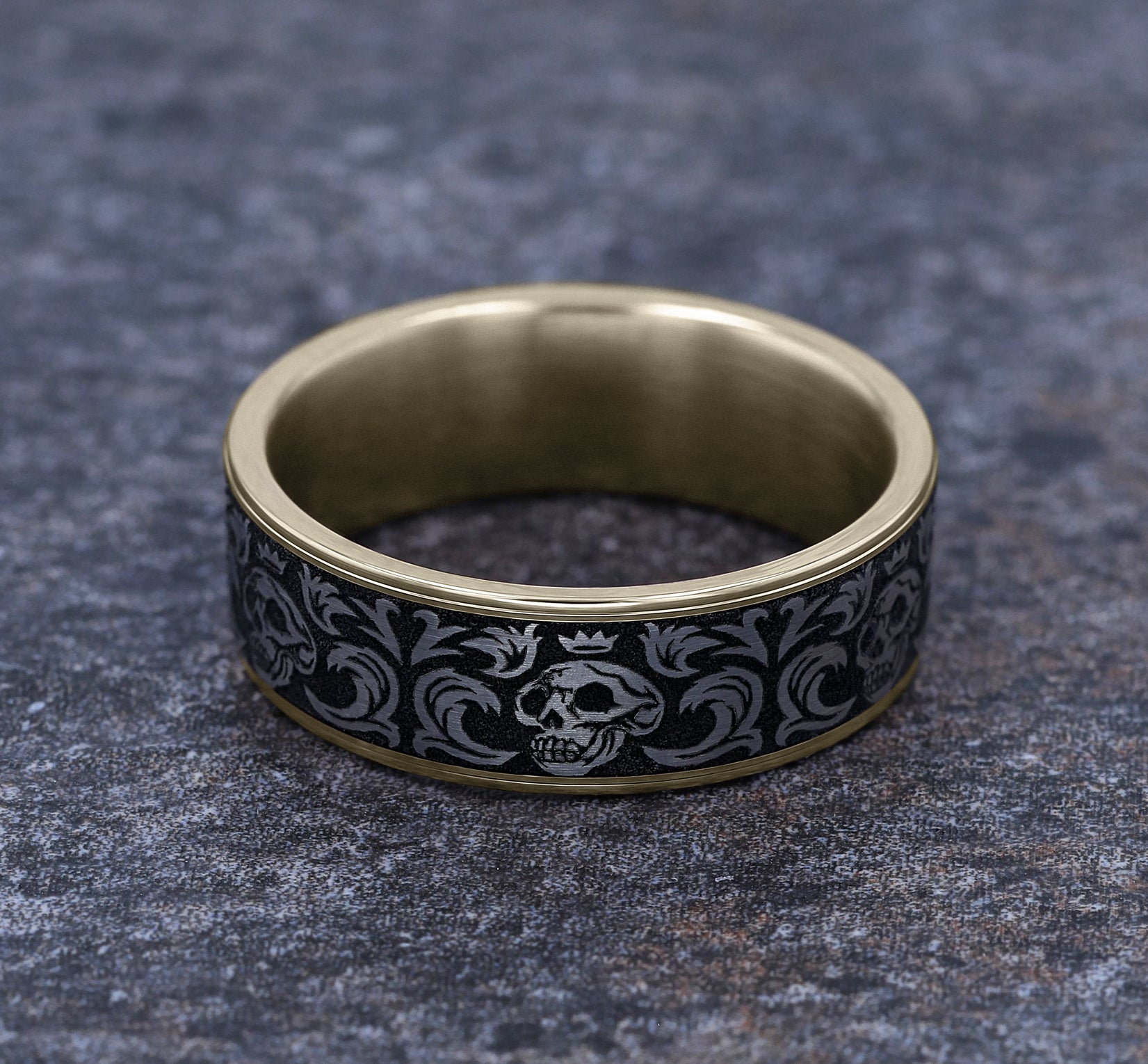 7.5mm, Comfort fit Grey Tantalum and 14K Rose Gold Skull king pattern, thin edges