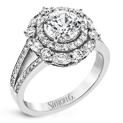 Rows of diamonds create a stunning effect in this 18k white gold engagement ring made for a round diamond. A total of .65 ctw of round diamonds and .35 ctw marquise diamonds surround the center stone. Center stone not included. Our rings can be designed to fit any center stone.