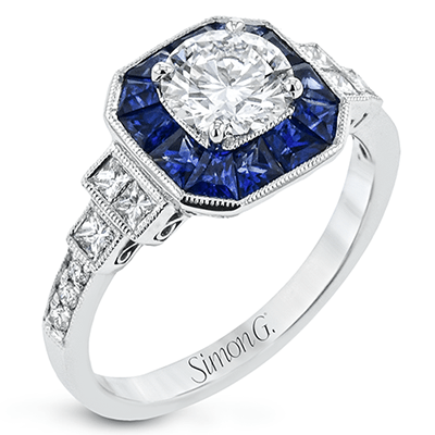 This 18k white gold engagement setting would be a perfect 'something blue' with .79 ctw of baguette sapphires in a halo surrounding the center stone. These are framed by .33 ctw of princess cut diamonds and .11 ctw of round brilliant diamonds. Center stone not included. Our rings can be designed to fit any center stone.