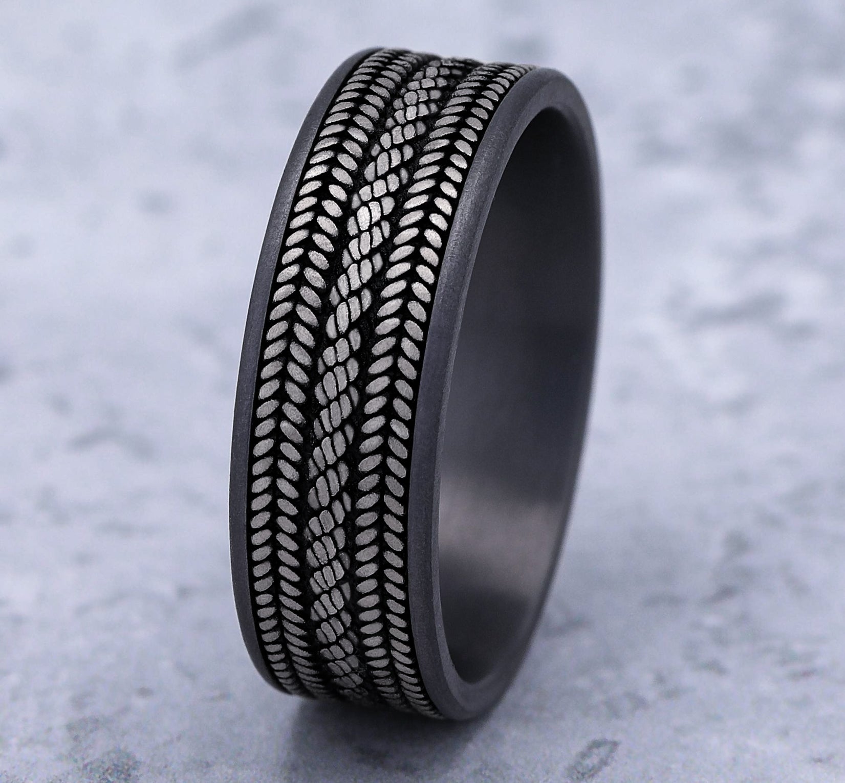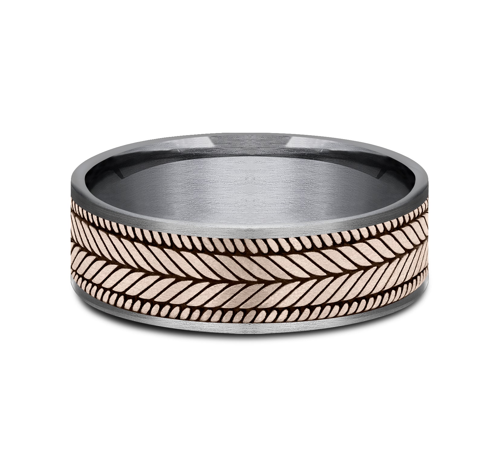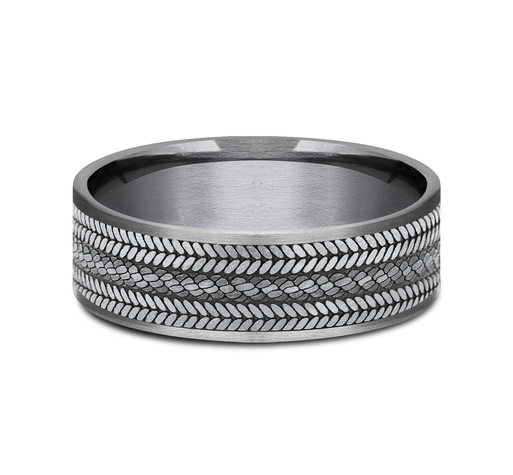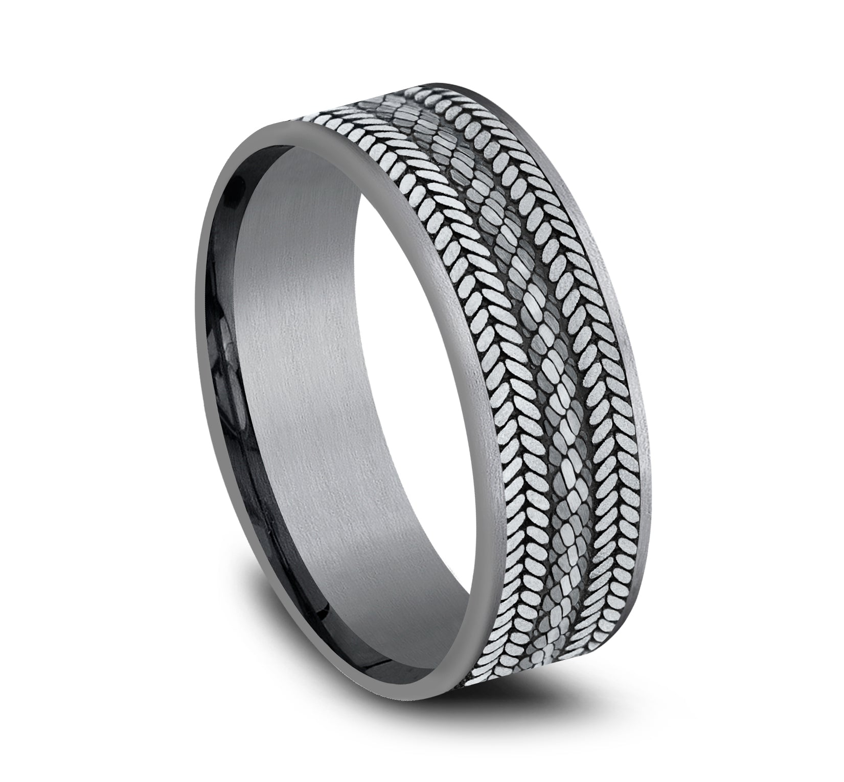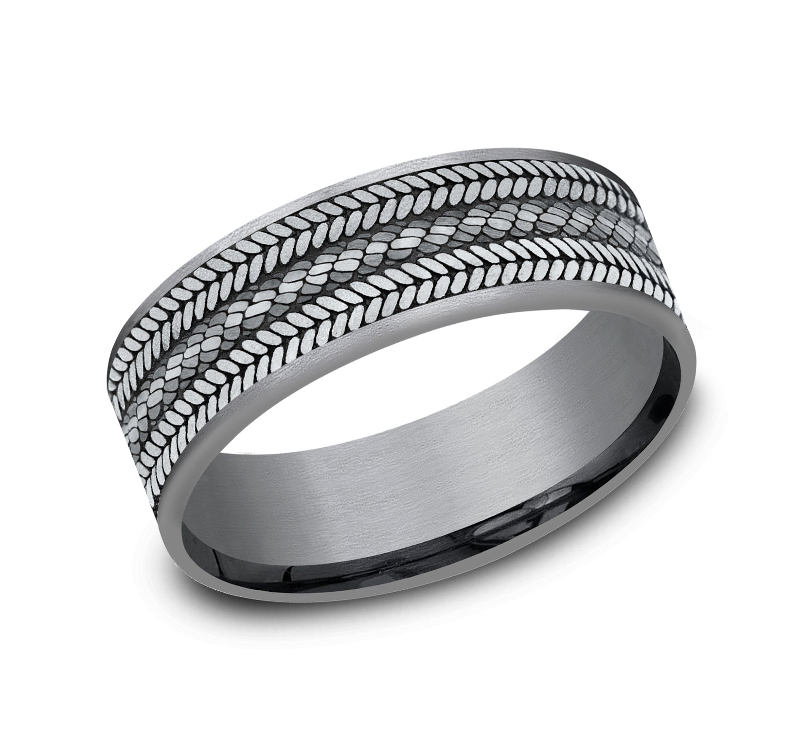 7.5mm, Comfort fit Grey Tantalum and 14K White Gold Rope center with chevron edge pattern, thin edges