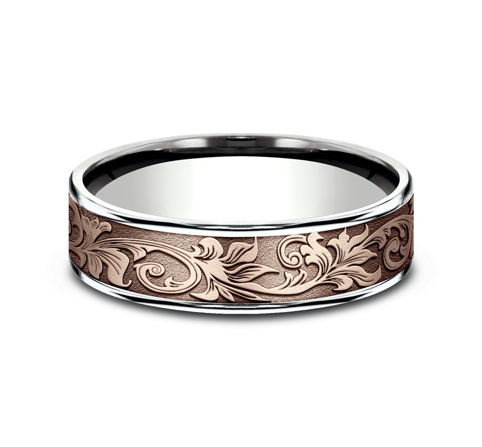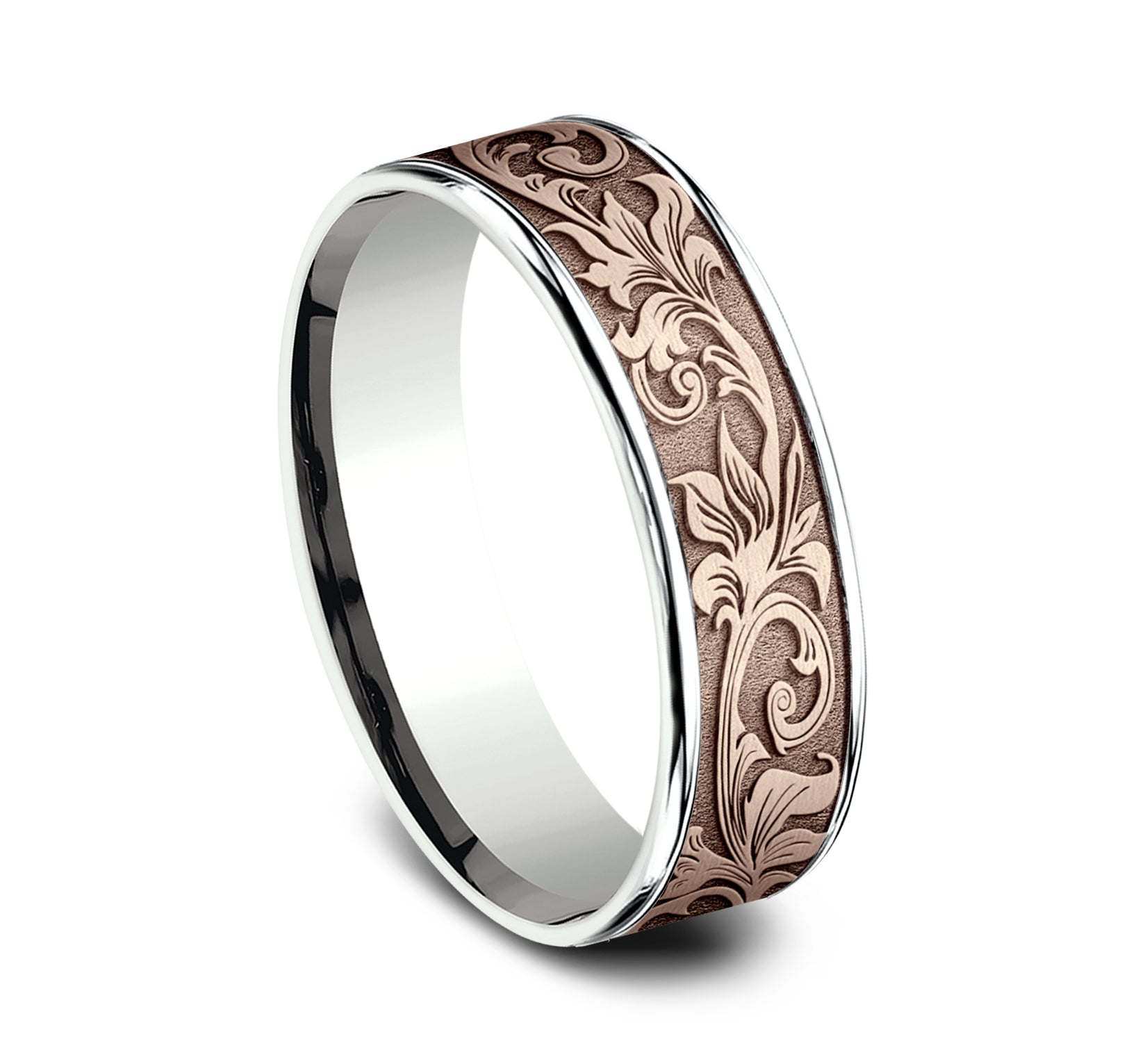 6.5mm, Comfort fit 14K White and Rose Gold Vintage script pattern, thin edges