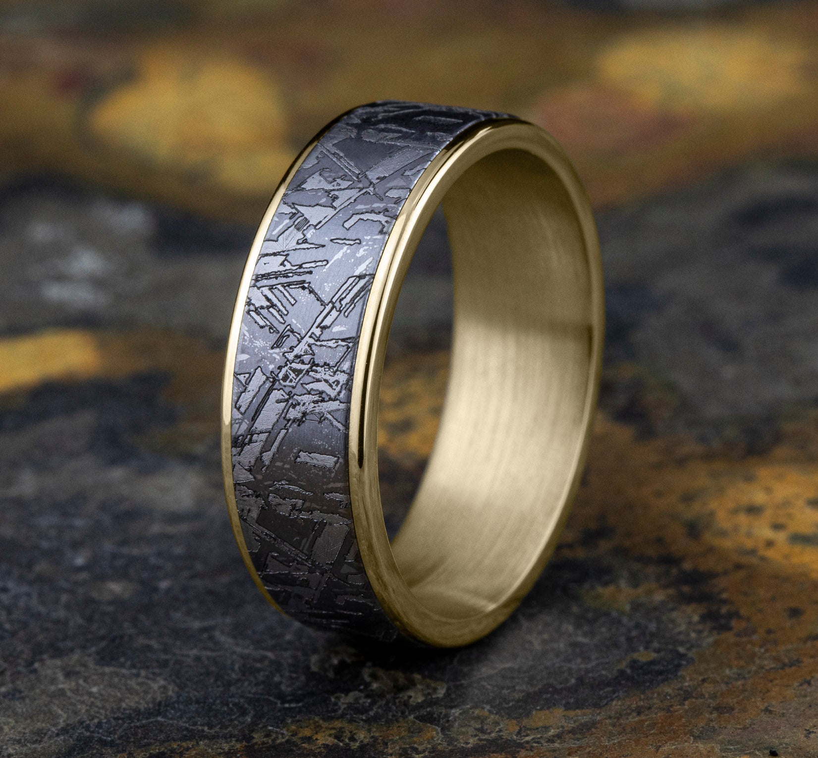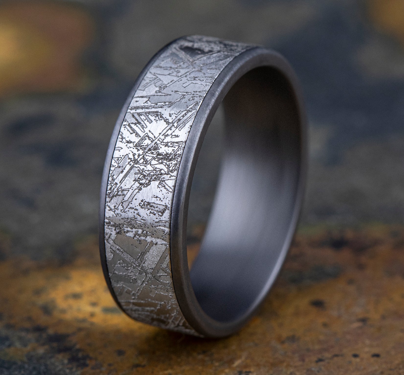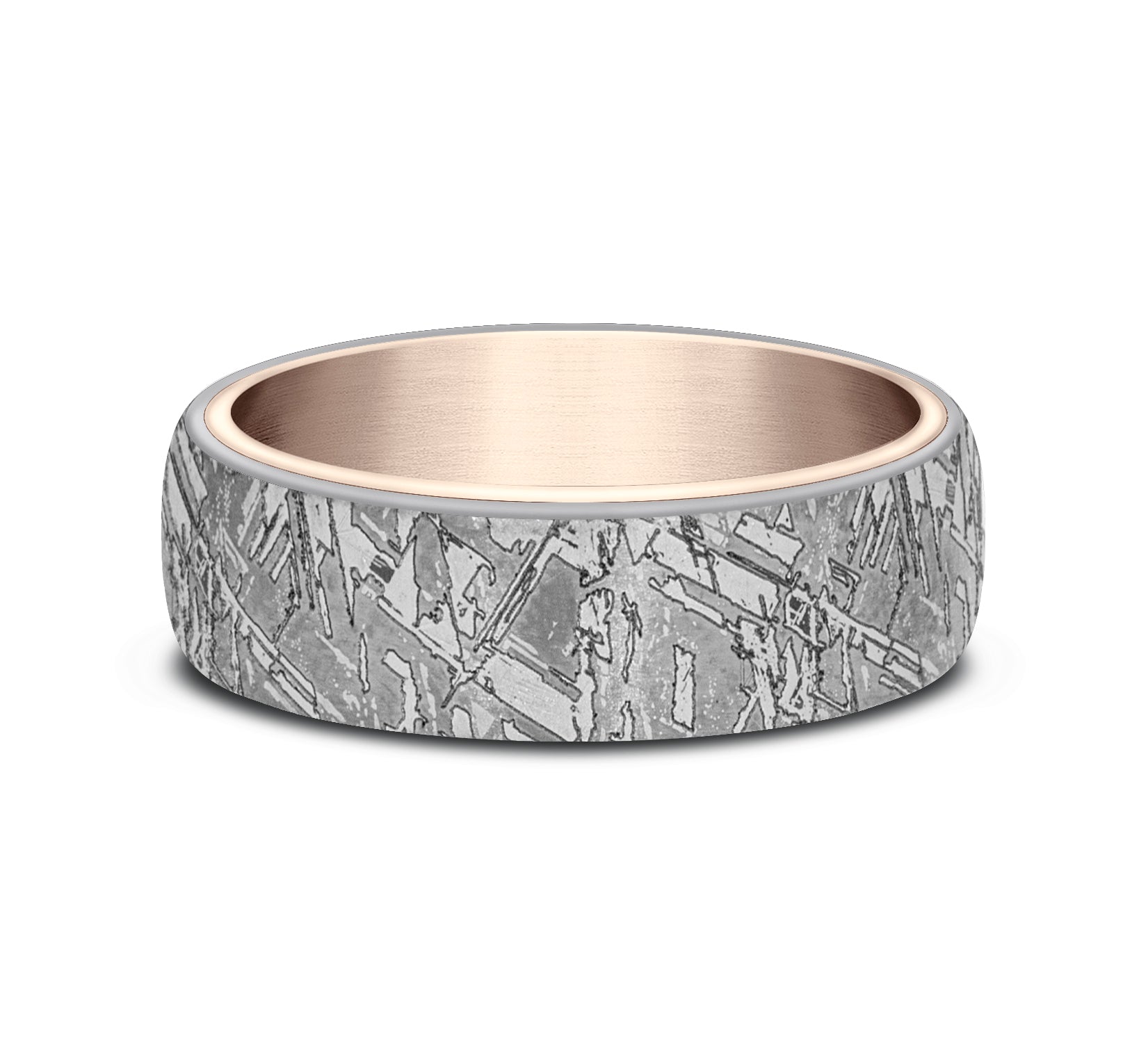 6.5mm, Comfort fit Grey Tantalum and 14K Rose Gold Meteorite pattern