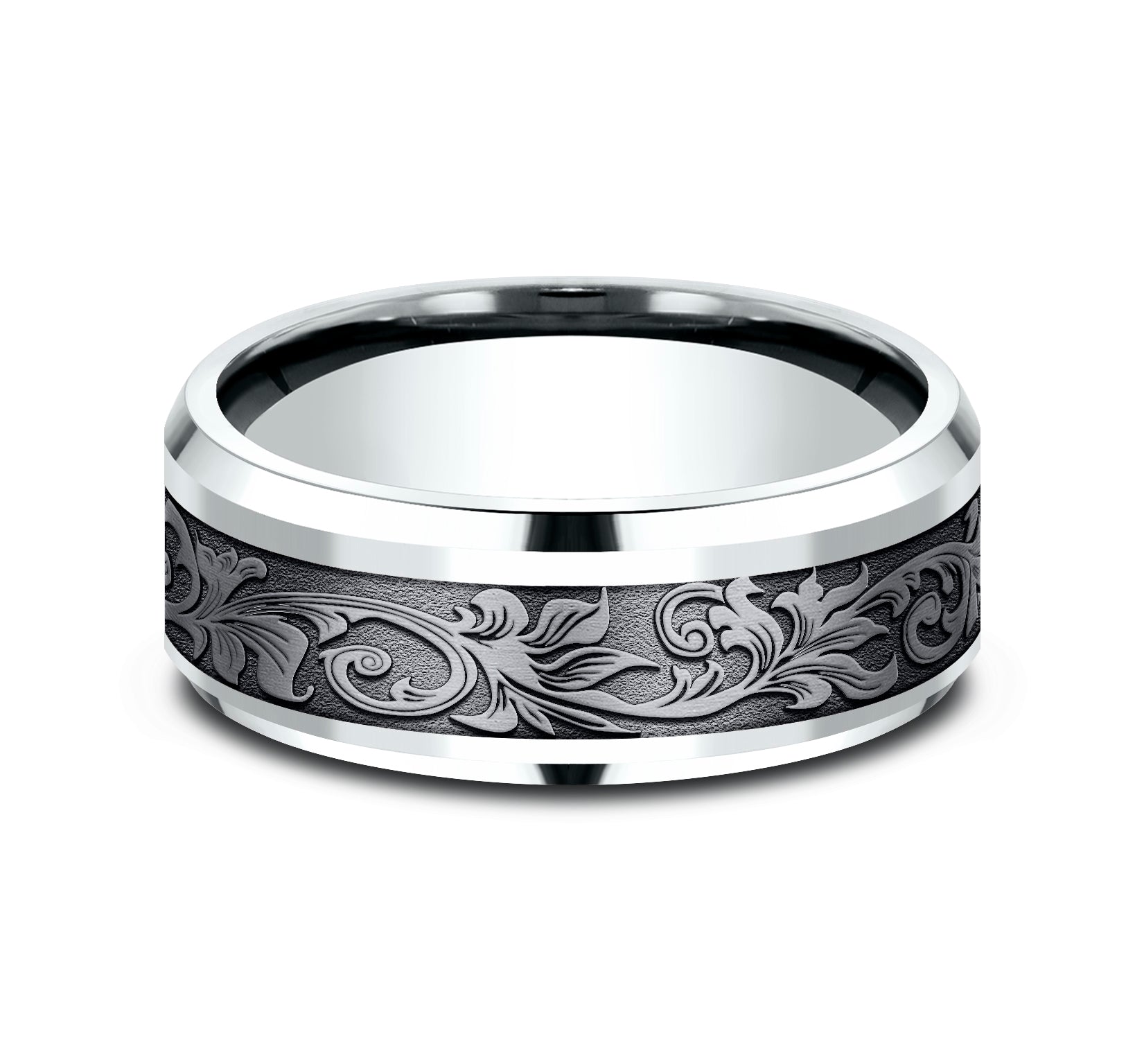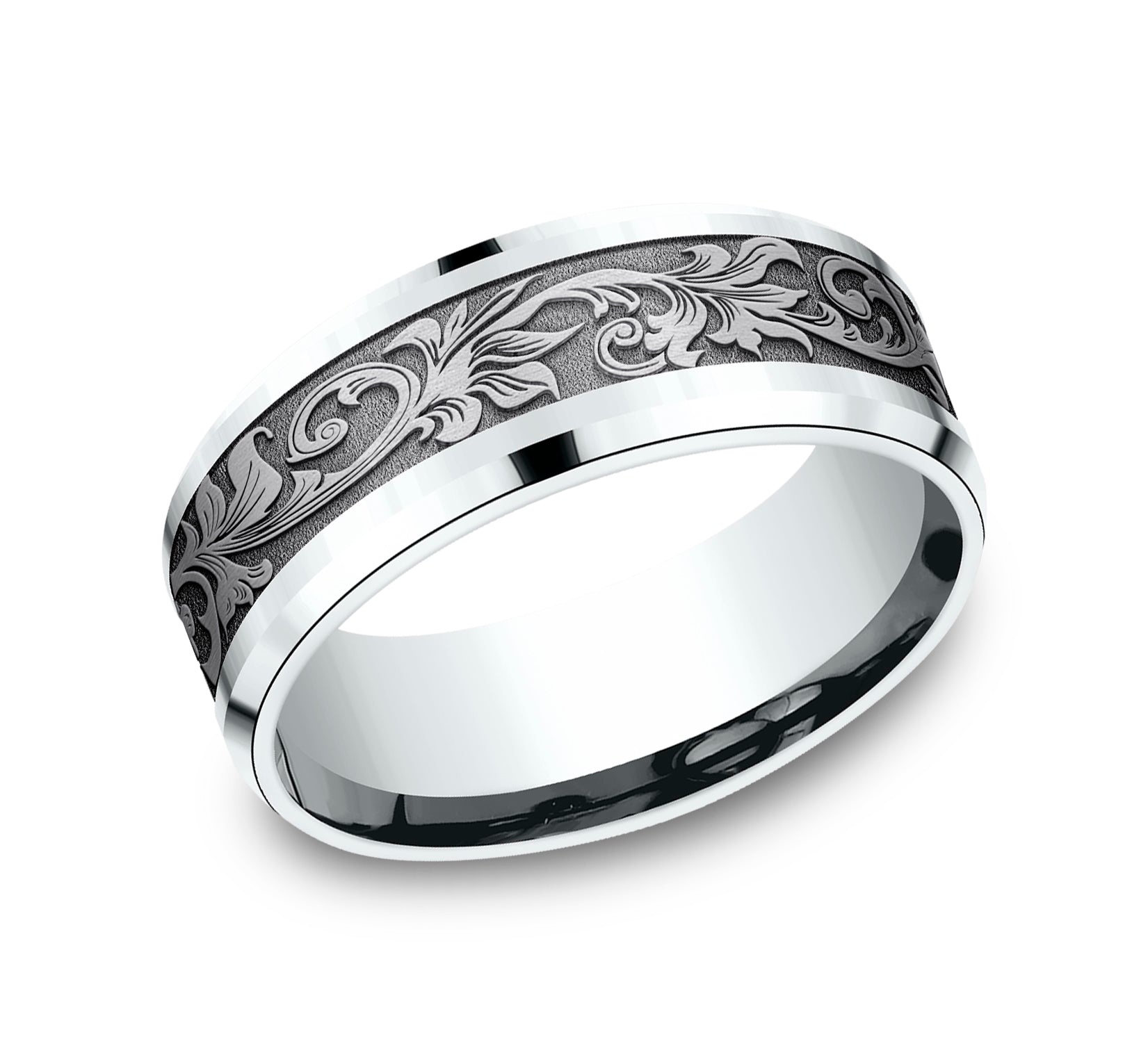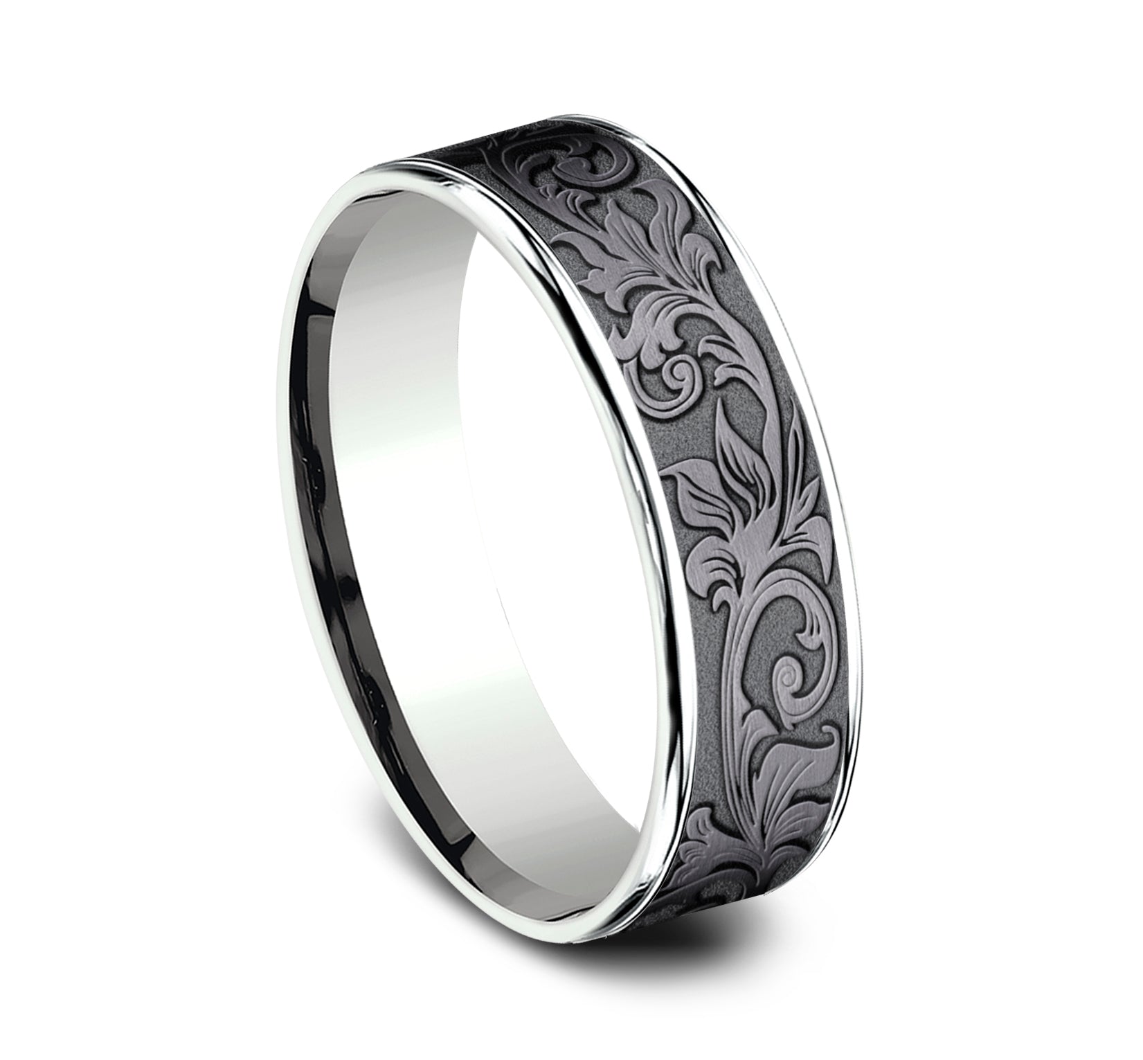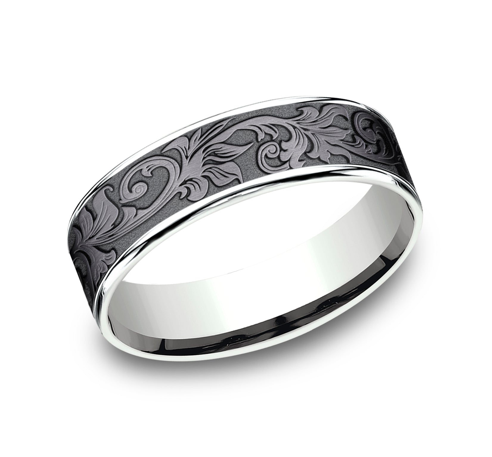 6.5mm, Comfort fit 14K White Gold and Darkened Tantalum Vintage script pattern, polished thin edges