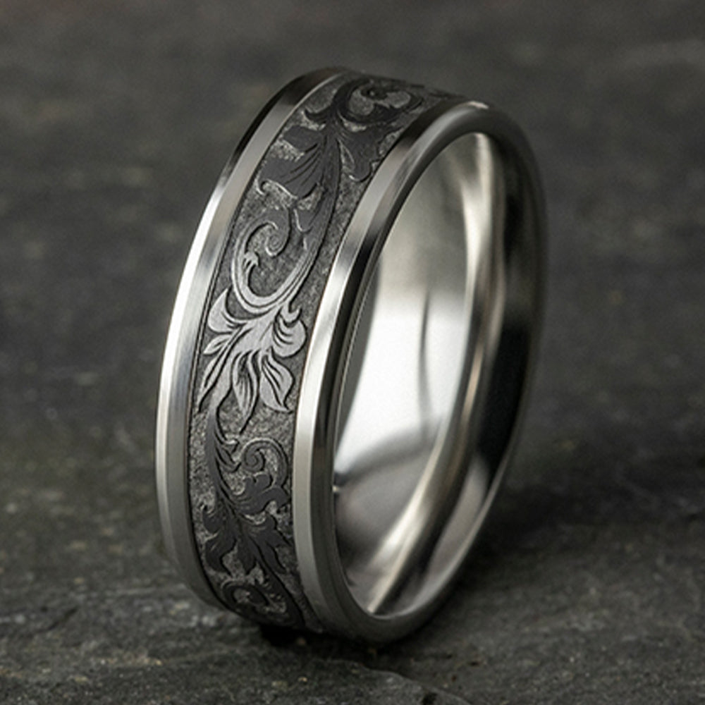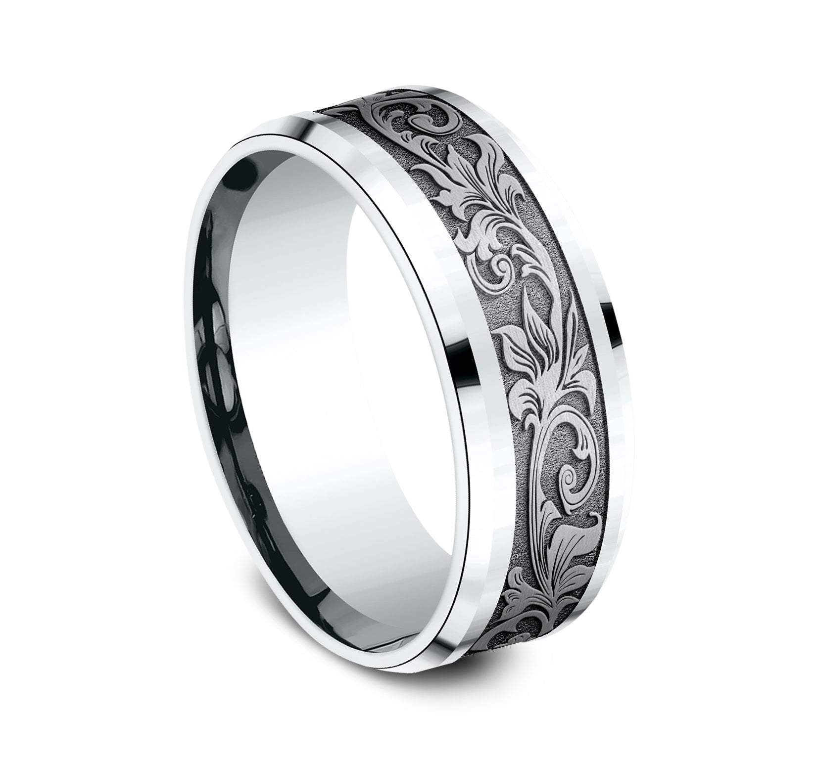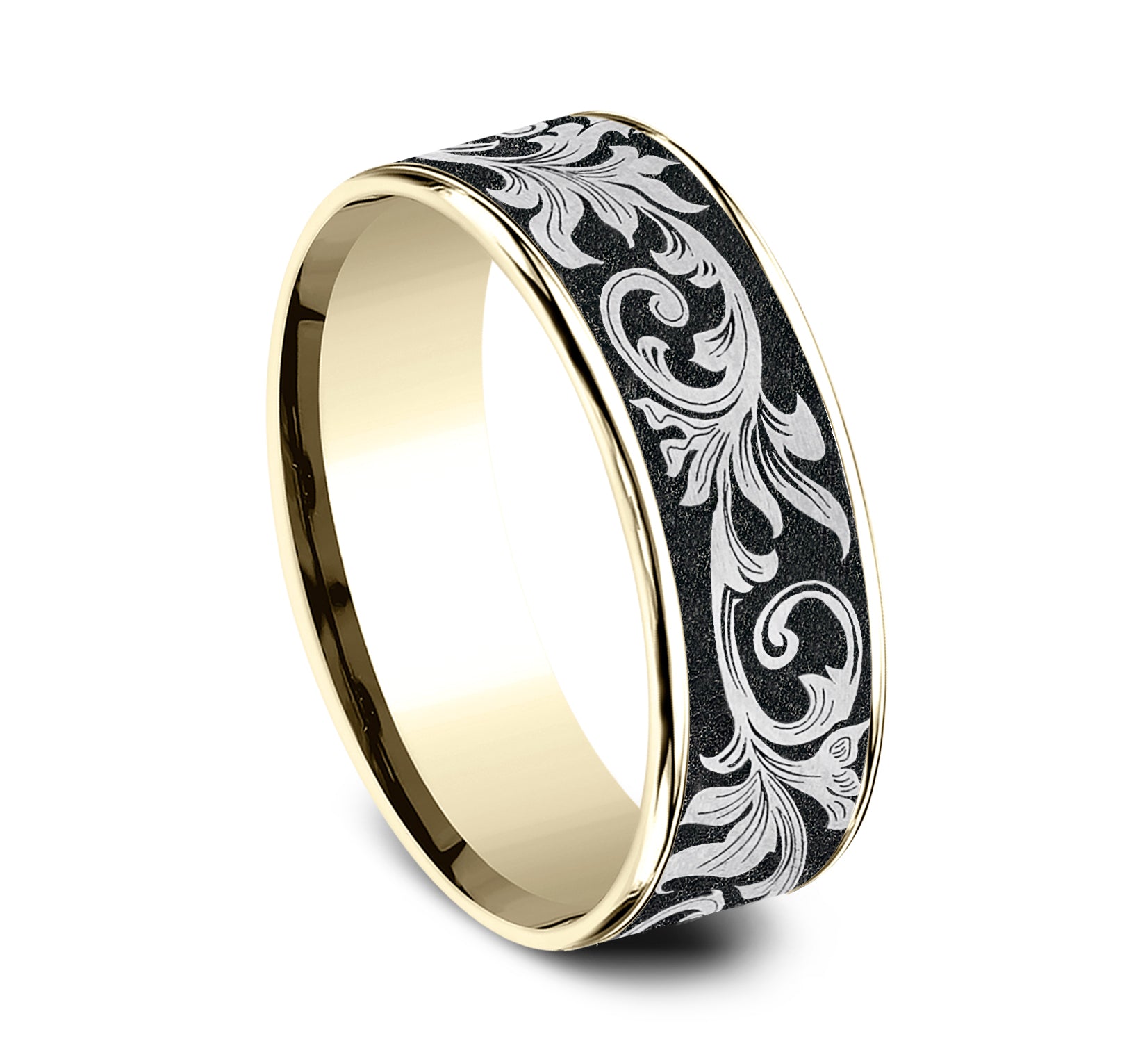 6.5mm, Comfort fit 14K White Gold and Darkened Tantalum Vintage script pattern, polished thin edges