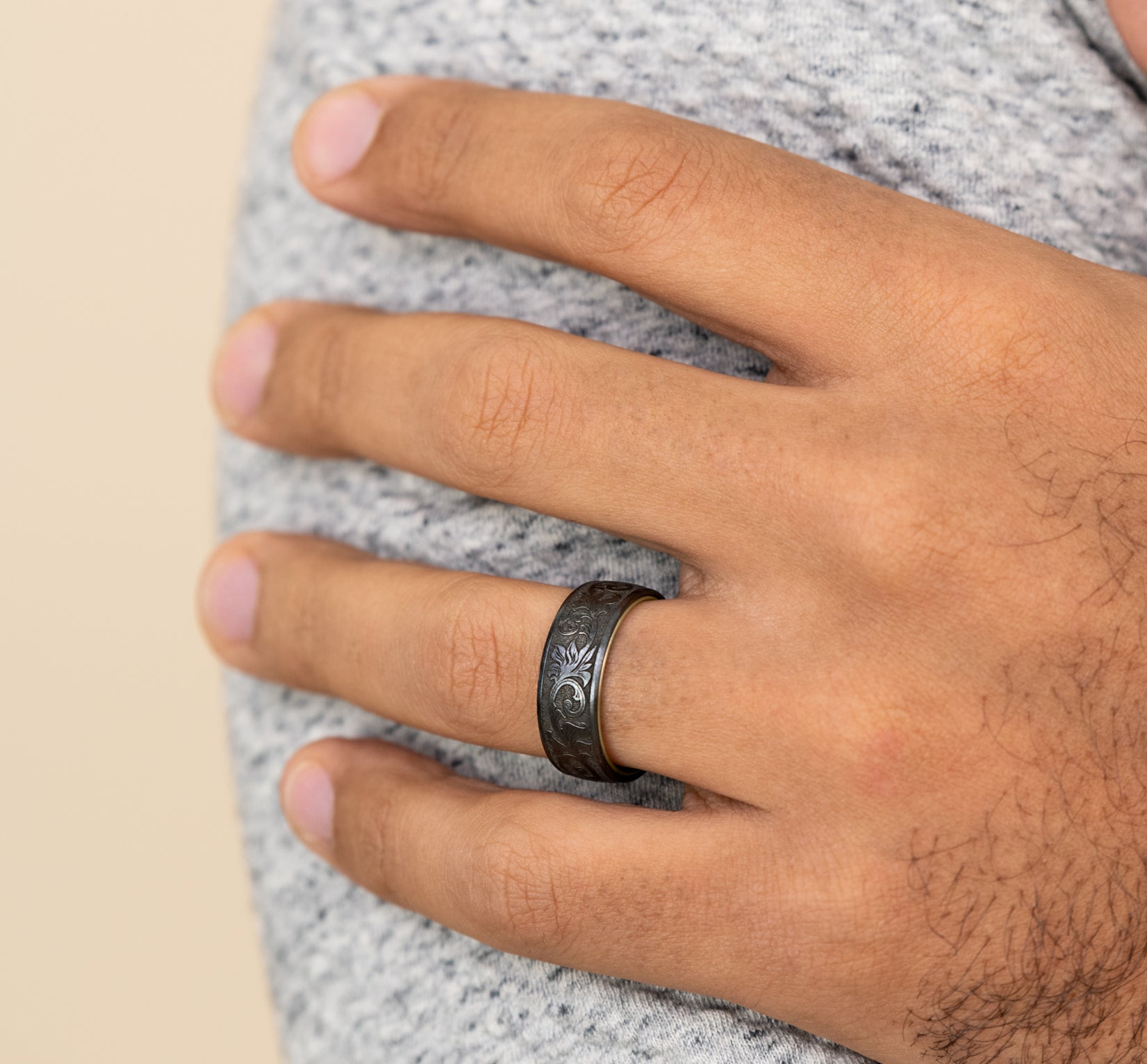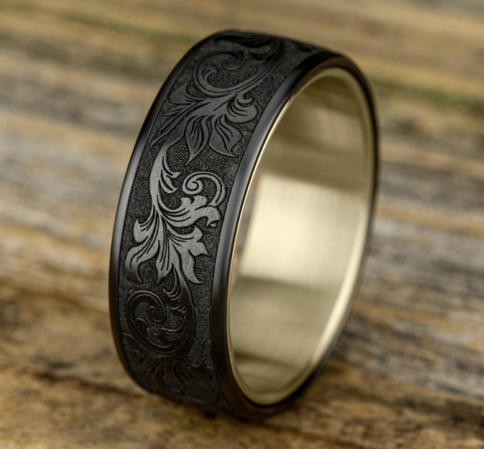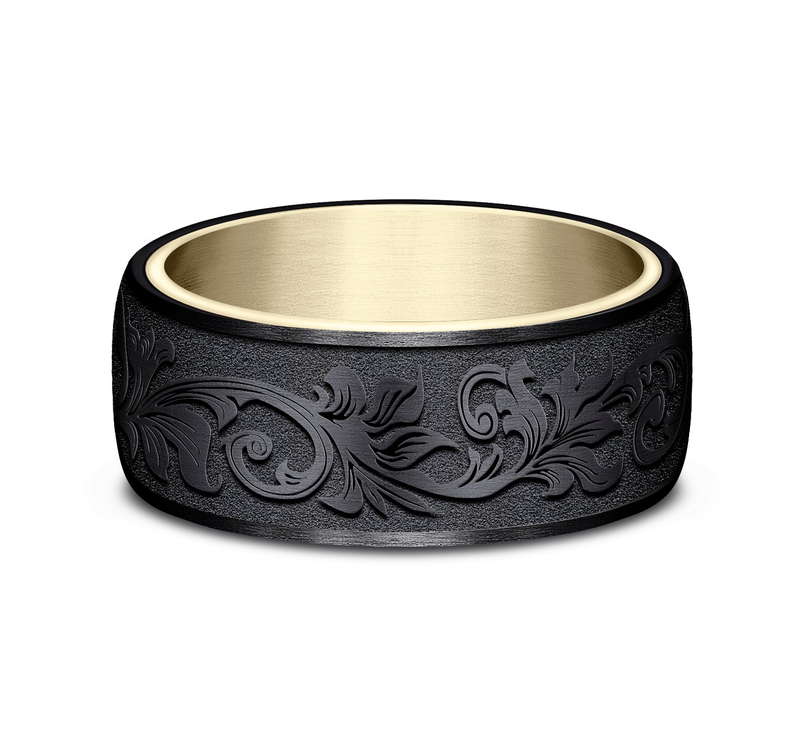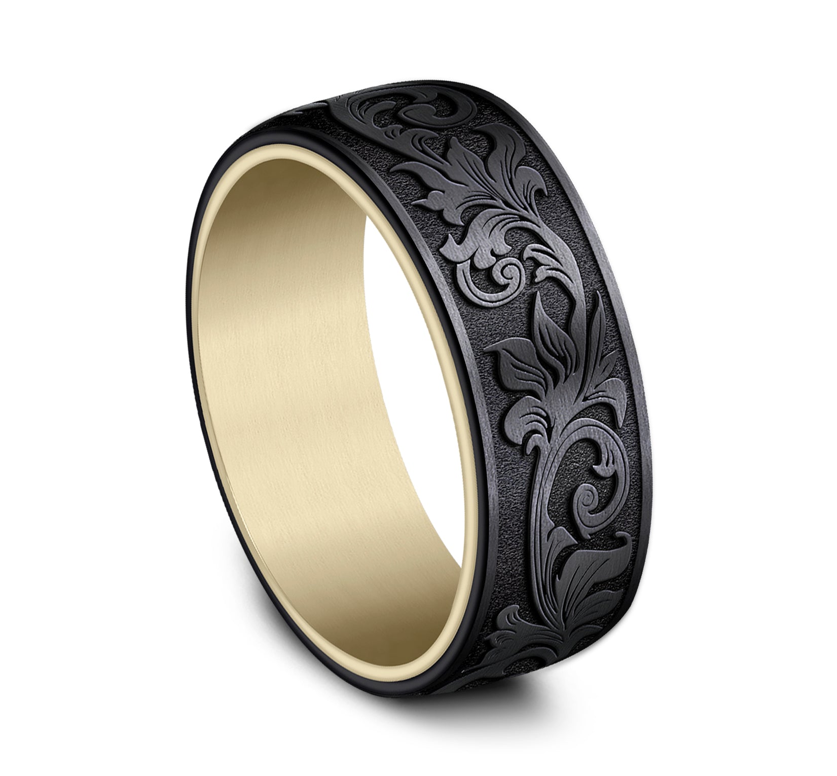 6.5mm, Comfort fit 14K White Gold and Darkened Tantalum Vintage script pattern, polished thin edges